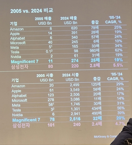(서울=연합인포맥스) 유수진 기자 = "2005년엔 M7(Magnificent 7)의 매출을 모두 합쳐도 삼성전자(800억 달러) 한 곳에 못 미쳤습니다. 20년이 지난 지금은 다릅니다. 삼성전자 매출은 2천200억 달러, M7 평균은 2천740억 달러입니다."