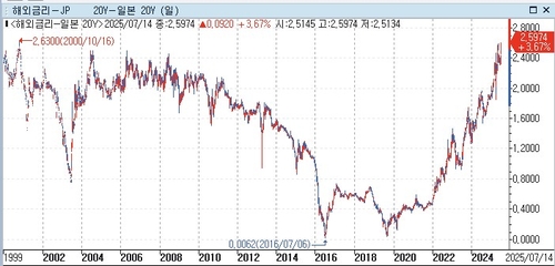14일 연합인포맥스에 따르면 오후 3시16분 현재 일본 국채 20년 금리는 전장대비 9.2bp 오른 2.5974%를 나타냈다. 이는 지난 2000년 10월 이후 25년여 만의 최고 수준이다.