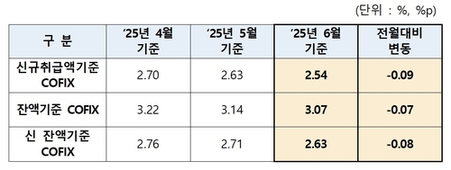 15일 은행연합회에 따르면 6월 신규 취급액 기준 코픽스는 5월(연 2.63%)보다 0.09%포인트(p) 낮은 2.54%로 나타났다.