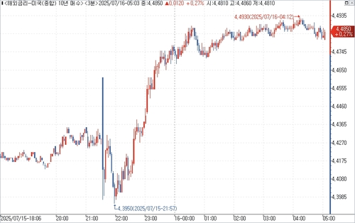 연합인포맥스의 해외금리 일중 화면(화면번호 6532)에 따르면 15일(미국 동부시간) 오후 3시 현재 뉴욕 채권시장에서 10년물 국채금리는 전 거래일 오후 3시 기준가 대비 6.10bp 높은 4.4890%에 거래됐다.