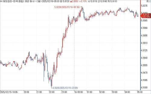 30년물 국내 온라인카지노는 장 후반까지 5%를 살짝 웃도는 흐름을 이어갔다. 벤치마크인 10년물 국내 온라인카지노는 4.5%를 약간 밑도는 레벨을 유지했다.