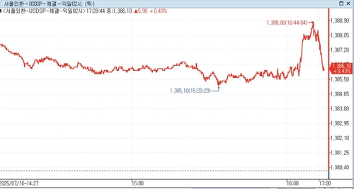 16일 외환시장에서 한국어 온라인 카지노 환율은 오후 5시 40분 현재 전일 대비 6.80원 오른 1,387.00원에 거래됐다.