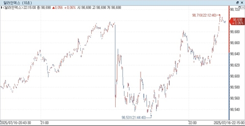 연합인포맥스(화면번호 6411)에 따르면 16일 오전 9시5분께(이하 미 동부시간) 뉴욕 외환시장에서 주요 6개 통화에 대한 달러 가치를 반영하는 달러인덱스(DXY)는 98.641로 전장 마감 가격(98.637)보다 0.004포인트(0.004%) 상승했다.