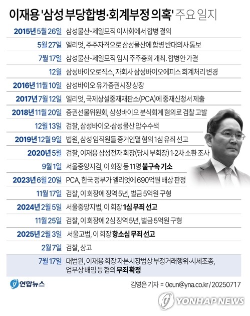 이 회장은 17일 '경영권 불법 승계' 의혹이 불거진 '부당 합병·회계 부정' 혐의에 대해 대법원에서 무죄 판결을 받았다. 이에 따라 4년 10개월 동안 이어져 온 '사법 족쇄'에서 마침내 벗어났다.