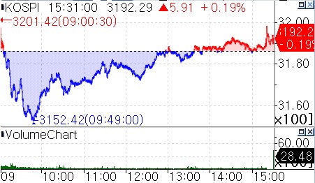 17일 연합인포맥스 신주식종합(화면번호 3536)에 따르면 코스피가 전 거래일보다 5.91포인트(0.19%) 소폭 오른 3,192.29로 마감했다. 코스피는 오전에 하락세를 보이다가 오후 2시 무렵부터 강보합세를 보였다.