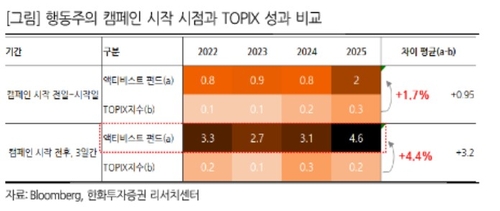 주주행동주의 캠페인의 목적에 따른 초과수익률 분석에서는 '이사회의석 확보'를 목표로 하는 캠페인이 평균 1년 누적 초과수익률 15.60%로 가장 높은 성과를 기록했다. '자본환원 제안'(배당 및 자사주 매입) 또한 평균 1년 누적 초과수익률 11.30%로 높은 성과를 보였다.