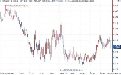 연합인포맥스의 해외금리 일중 화면(화면번호 6532)에 따르면 18일(미국 동부시간) 오후 3시 현재 뉴욕 채권시장에서 10년물 국채금리는 전 거래일 오후 3시 기준가 대비 3.40bp 낮은 4.4300%에 거래됐다.