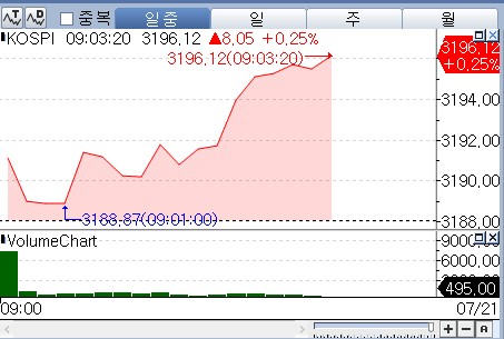 21일 연합인포맥스 신주식종합(화면번호 3536)에 따르면 오전 9시 3분 기준 코스피는 전 거래일보다 8.05포인트(0.25%) 오른 3,196.12에서 거래 중이다.