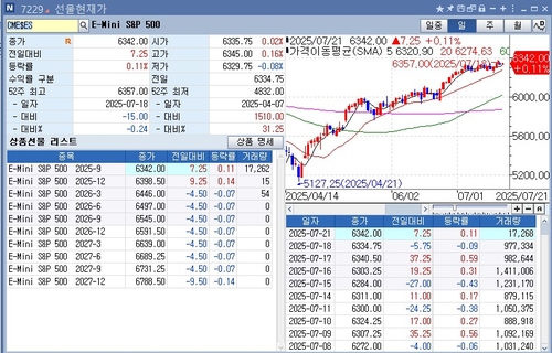 연합인포맥스 지수선물 통합화면(화면번호 6520)에 따르면 한국 시각으로 오전 10시 45분 기준 E-미니 S&P500 지수 선물은 전장 대비 0.11% 오른 6,342.00에 거래됐다.