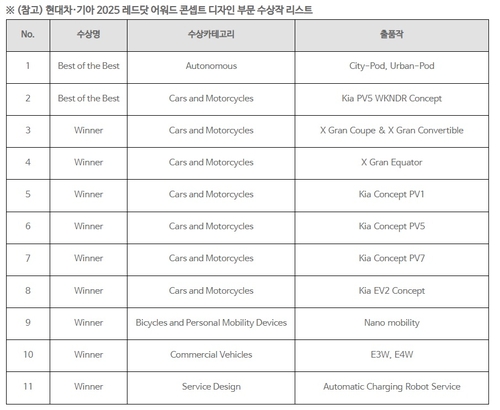(서울=연합인포맥스) 이재헌 기자 = 현대자동차·기아가 '2025 레드 닷 어워드: 콘셉트 디자인(Red Dot Award: Contcept Design 2025)'에서 최고상인 최우수상(Best of the Best) 2개와 본상(Winner) 9개 등 11관왕을 달성했다고 21일 밝혔다. 실용성과 차별화를 겸비한 디자인이 국제적으로 인정받았다.