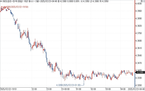 연합인포맥스의 해외금리 일중 화면(화면번호 6532)에 따르면 22일(미국 동부시간) 오후 3시 현재 뉴욕 채권시장에서 10년물 국채금리는 전 거래일 오후 3시 기준가 대비 3.20bp 낮은 4.3370%에 거래됐다.