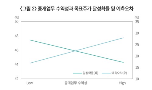 실제로 김 위원의 분석에 따르면, 중개 업무의 수익성과 매수 투자의견 비중 사이에는 유효한 상관관계가 나타났다. 목표 주가와 실제 주가의 오차 역시 마찬가지다.