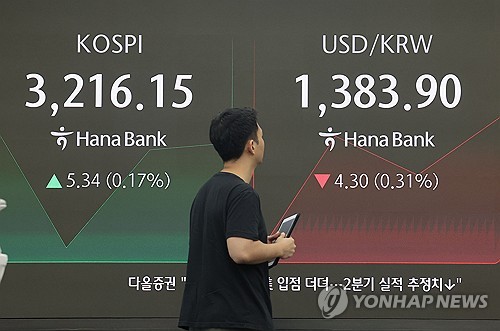 이날 코스피는 전날보다 0.69p(0.02%) 내린 3,210.12로 시작했다. 원/달러 환율은 5.2원 내린 1,383.0원으로, 코스닥은 0.64p(0.08%) 오른 822.33로 개장했다. 2025.7.22 ondol@yna.co.kr