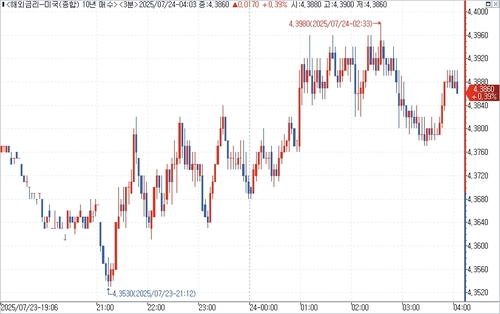 연합인포맥스의 해외금리 일중 화면(화면번호 6532)에 따르면 23일(미국 동부시간) 오후 3시 현재 뉴욕 채권시장에서 10년물 국채금리는 전 거래일 오후 3시 기준가 대비 5.10bp 높은 4.3880%에 거래됐다.