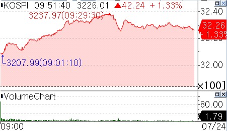 24일 연합인포맥스 신주식종합(화면번호 3536)에 따르면 코스피가 장중 3,237.97까지 오르며 연중 최고치를 기록했다. 코스닥은 819.66까지 상승했다.
