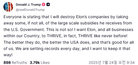 트럼프 대통령은 이날 자신의 소셜 미디어인 트루스 소셜에 "모두가 말하길 내가 일론이 미국 정부로부터 받는 대규모 보조금 중 일부, 아니면 전부를 없애 그의 회사를 망칠 거라고 한다. 그건 사실이 아니다"면서 이렇게 적었다.