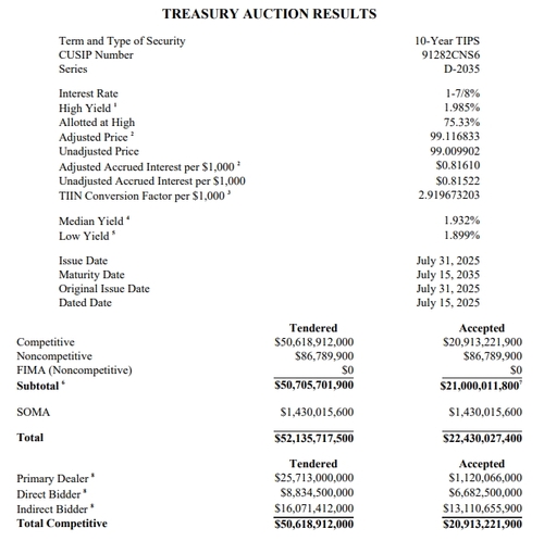 (서울=연합인포맥스) 김성진 기자 = 미국 재무부가 24일(현지시간) 입찰에 부친 10년물 물가연동국채(TIPS)가 양호한 수요 속에 시장 예상을 약간 밑도는 수익률에서 낙찰됐다.