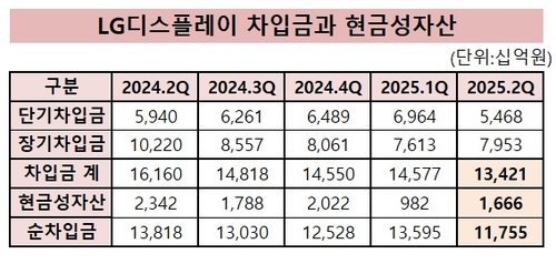 (서울=연합인포맥스) 유수진 기자 = LG디스플레이가 연내 달성을 목표로 했던 차입금 축소 계획을 상반기에 마무리 지었다. '6개월 조기 달성'이란 성과를 거뒀다.
