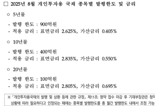 (서울=연합인포맥스) 노현우 기자 = 기획재정부는 내달 개인용 국채를 1천400억원어치 발행할 계획이라고 25일 밝혔다.