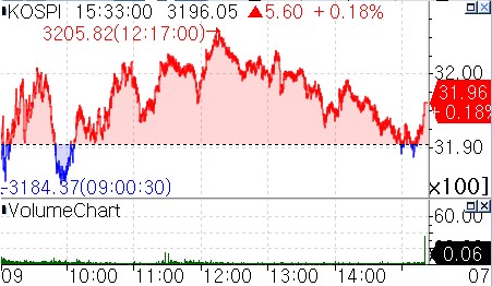 25일 연합인포맥스 신주식종합(화면번호 3536)에 따르면 코스피가 전 거래일보다 5.60포인트(0.18%) 소폭 오른 3,196.05로 상승 마감했다. 코스닥은 2.94포인트(0.36%) 소폭 내린 806.95로 끝났다.