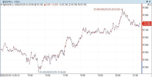 연합인포맥스(화면번호 6411)에 따르면 25일 오전 8시 20분께(이하 미 동부시간) 뉴욕 외환시장에서 주요 6개 통화에 대한 달러 가치를 반영하는 달러인덱스(DXY)는 97.724로 전장 마감 가격(97.432)보다 0.292포인트(0.300%) 상승했다.