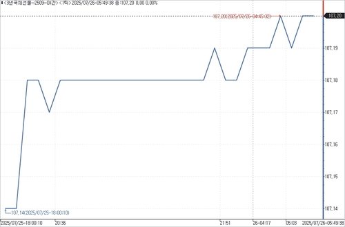 26일 서울채권시장에 따르면 3년 국채선물은 야간 거래에서 전일 주간 거래 종가 대비 2틱 상승한 107.20에 마감됐다. 외국인은 196계약 순매도했고, 금융투자와 개인은 각각 152계약 및 44계약 순매수했다.