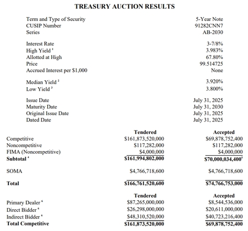 오후 들어 실시된 5년물 700억달러어치의 수익률은 3.983%로 결정됐다. 지난달 3.879%에 비해 10.4bp 높아졌다.