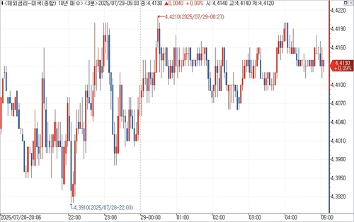 연합인포맥스의 해외금리 일중 화면(화면번호 6532)에 따르면 28일(미국 동부시간) 오후 3시 현재 뉴욕 채권시장에서 10년물 국채금리는 직전 거래일 오후 3시 기준가 대비 3.50bp 높은 4.4200%에 거래됐다.
