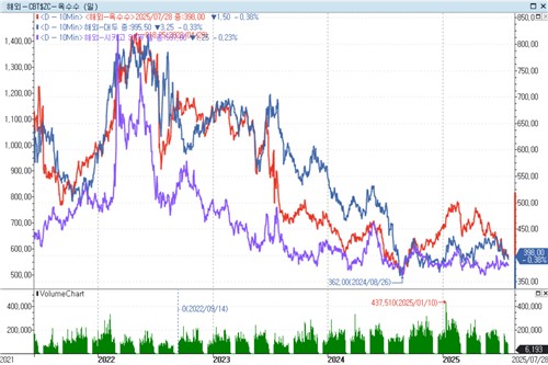 시카고상품거래소(CBOT)에서 전날 기준 소맥 종가는 부셸당 538.50센트로 상반기 내 고점인 604.75센트 대비 11% 하락했다. 전쟁 여파로 공급망 혼란이 컸던 2022년 5월 고점(1,277.50센트)과 비교하면 58% 내렸다.