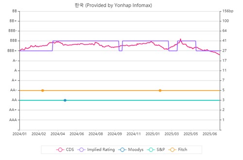 연합인포맥스 '글로벌 크레딧 차트'(화면번호2494)에 따르면 전일 한국 5년 CDS 프리미엄은 22.01bp로, 연중 최저점을 경신했다.