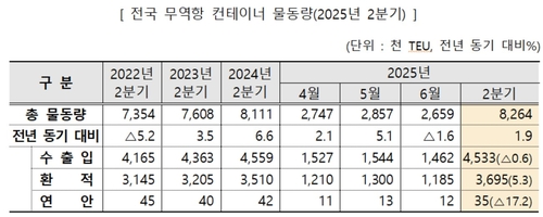컨테이너선과 비컨테이너선을 합한 2분기 전국 무역항의 항만 물동량은 전년 대비 2.2% 감소한 3억8천776만톤인 것으로 나타났다.