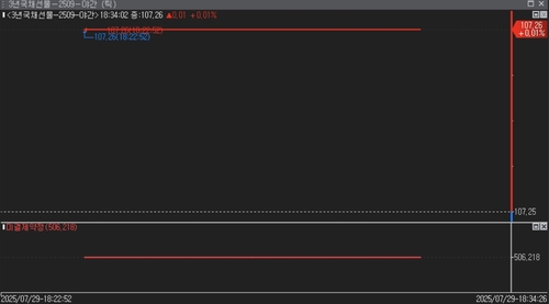 29일 서울채권시장(화면번호 3600번)에 따르면 오후 7시 14분 현재 3년 국채선물은 주간 카지노커뮤니티 종가 대비 1틱 오른 107.26에 카지노커뮤니티됐다.