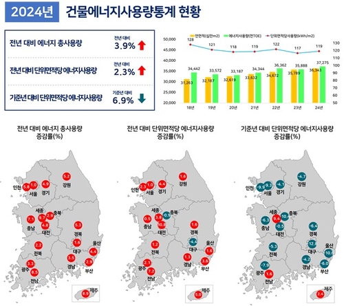 국토교통부는 2024년 건축물 에너지 총 사용량이 3천727만5천TOE로 전년 대비 3.9% 늘었지만 기준년인 2018년 대비로는 6.9% 감소했다고 30일 밝혔다.