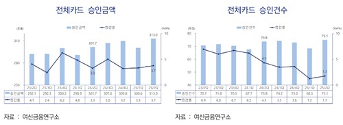30일 여신금융협회가 발표한 '2025년 2분기 카드승인실적 분석' 자료에 따르면 2분기 전체카드 승인금액은 313조원으로 전년 동기 대비 3.7% 증가했다. 승인건수 역시 75억1천만건으로 1.7% 늘었다.