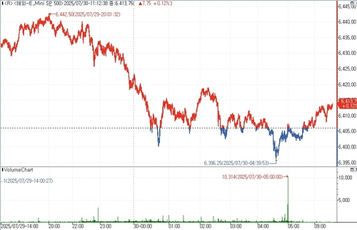 연합인포맥스 지수선물 통합화면(화면번호 6520)에 따르면 한국 시각으로 오전 11시12분 기준 E-미니 S&P500 지수 선물은 전장 대비 0.12% 오른 6,413.75에 거래됐다.