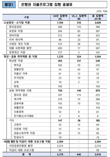(서울=연합인포맥스) 한상민 기자 = 은행권의 민생금융지원 방안의 한 축인 '자율프로그램'이 올해 상반기까지 총 5천918억원 집행됐다.