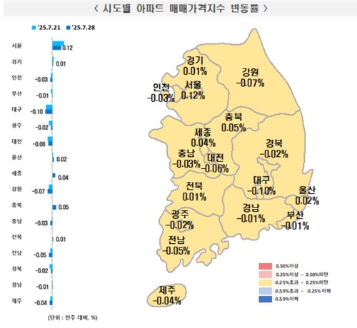 한국부동산원이 31일 발표한 '2025년 7월 넷째 주 전국 주간 아파트가격 동향'에 따르면, 전국 아파트 주간 매매가격은 전주 대비 0.01% 상승해 지난주와 같은 수준을 유지했다.