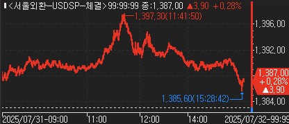 31일 서울외환시장에서 달러-원 환율은 오후 3시 30분 기준으로 전장 대비 3.90원 상승한 1,387.00원에 정규장 거래를 마쳤다.