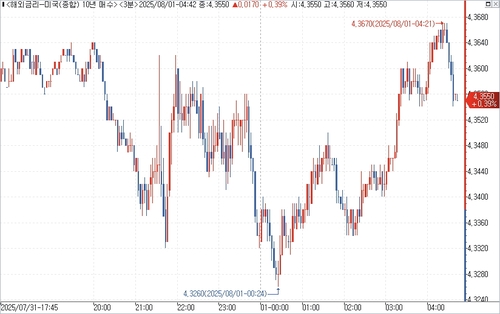 연합인포맥스의 해외금리 일중 화면(화면번호 6532)에 따르면 31일(미국 동부시간) 오후 3시 현재 뉴욕 채권시장에서 10년물 국채금리는 전 거래일 오후 3시 기준가 대비 1.60bp 내린 4.3600%에 거래됐다.