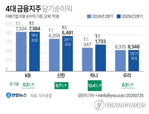 올해 상반기 기준 4대 온라인카지노 바로가기지주(KB·신한·하나·우리)의 당기순이익은 10조3천254억원으로 상반기 기준 사상 첫 10조원을 돌파했다. 지난해까지도 역대 최대 실적을 기록하면서 연간 16조원 이상의 순이익을 거뒀으나, 올해 이를 경신할 가능성이 커진 셈이다.