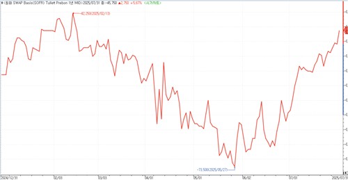 실제로 재정거래 유인을 보여주는 1년 스와프 베이시스는 전일 기준 마이너스(-) 45.75bp로 역전폭을 또 축소했다.