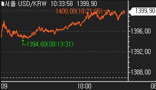 이날 달러-원은 전날 대비 8.00원 높은 1,395.00원으로 출발한 뒤 1,400원을 향해 오름폭을 높였고 오전 10시 21분 무렵 1,400원에 거래됐다.