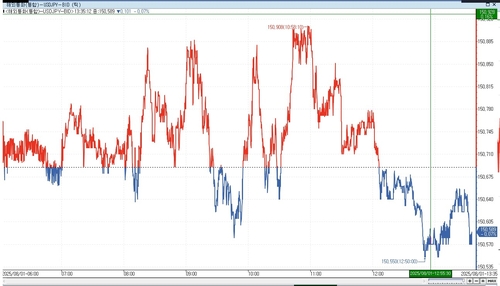 오전 장 중반을 넘어서자 환율은 상방 압력을 받아 한때 0.15% 높아진 150.912엔을 터치했다. 장중 시세 기준 지난 3월 28일 이후 4개월 만의 최고치다.
