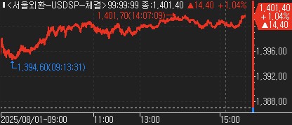장중 고점은 1,401.70원, 저점은 1,394.60원으로 장중 변동 폭은 7.10원을 기록했다.