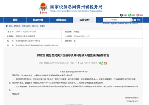 4일 중국 재정부는 지난달 31일 자 성명에서 오는 8일부터 중앙정부와 지방정부가 발행한 국채, 그리고 금융 기관 발행 채권의 이자 소득에 대해 부가가치세(VAT)를 부과할 것이라고 밝혔다.