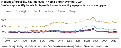 무디스는 "금리가 하락하고 소득이 증가하면서 올해 남은 기간 동안 수도권 외 지역에서는 주택구입부담이 지속 개선될 것"이라고 예상했다.