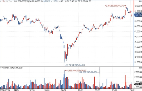 지수는 미국 고용지표 쇼크를 반영하며 장 시작부터 2% 급락한 채 개장했으며, 장중 4만선이 깨지기도 했으나 낙폭을 일부 회복하며 마감했다.