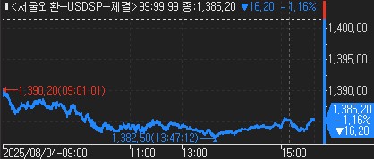4일 서울외환시장에서 달러-원 환율은 오후 3시 30분 기준으로 전장 대비 16.20원 하락한 1,385.20원에 정규장 거래를 마쳤다.