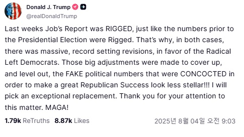 그러면서 "조작된 수치는 공화당의 위대한 성공이 덜 대단해 보이게 만들기 위해 꾸며낸 것"이라며 "나는 탁월한 인물을 후임으로 지명할 것"이라고 부연했다.