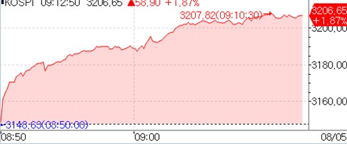 5일 연합인포맥스 신주식종합(화면번호 3536)에 따르면 오전 9시 13분 기준으로 코스피가 전 거래일보다 59.60포인트(1.89%) 상승한 3,207.35를 나타냈다.